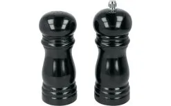 Kompaktes Salstreuer-Pfeffermühlen Duo aus lackiertem Holz. Mühle mit verstellbarem Keramikmahlwerk.