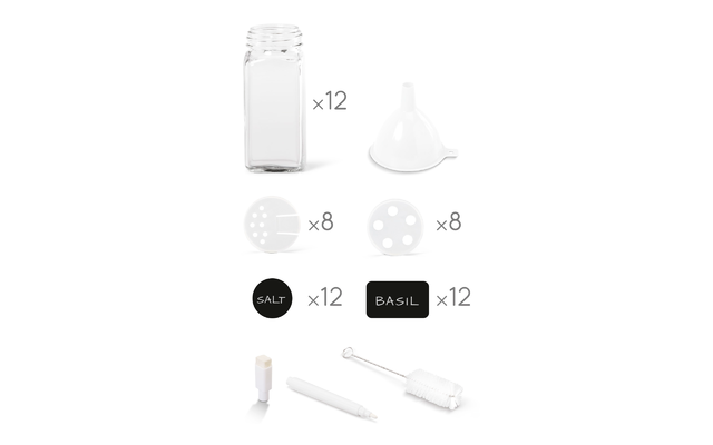 • Mit 16 austauschbaren Streueinsätzen (8 x fein, 8 x grob) und 24 selbstklebenden Etiketten (12 x rund, 12 x rechteckig)