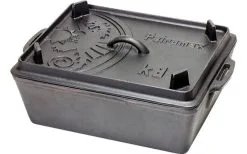 Aus Gusseisen gefertigt, hat die Kastenform eine exzellente Wärmeleitung und -speicherung. Ganz gleich ob du sie am offenen Feuer verwendest oder auf dem Deckel Briketts verteilst: Die entstehende Rundumwärme überzeugt im Backofen zuhause und in der Outdoor-Küche. Durch das sogenannte seasoned finish ist die Kastenform direkt einsatzbereit.