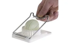 Die einzeln gespannten Edelstahldrähte zerschneiden das hartgekochte Ei schnell und sauber in runde oder ovale Scheiben, ohne dass das Eigelb zerbricht.